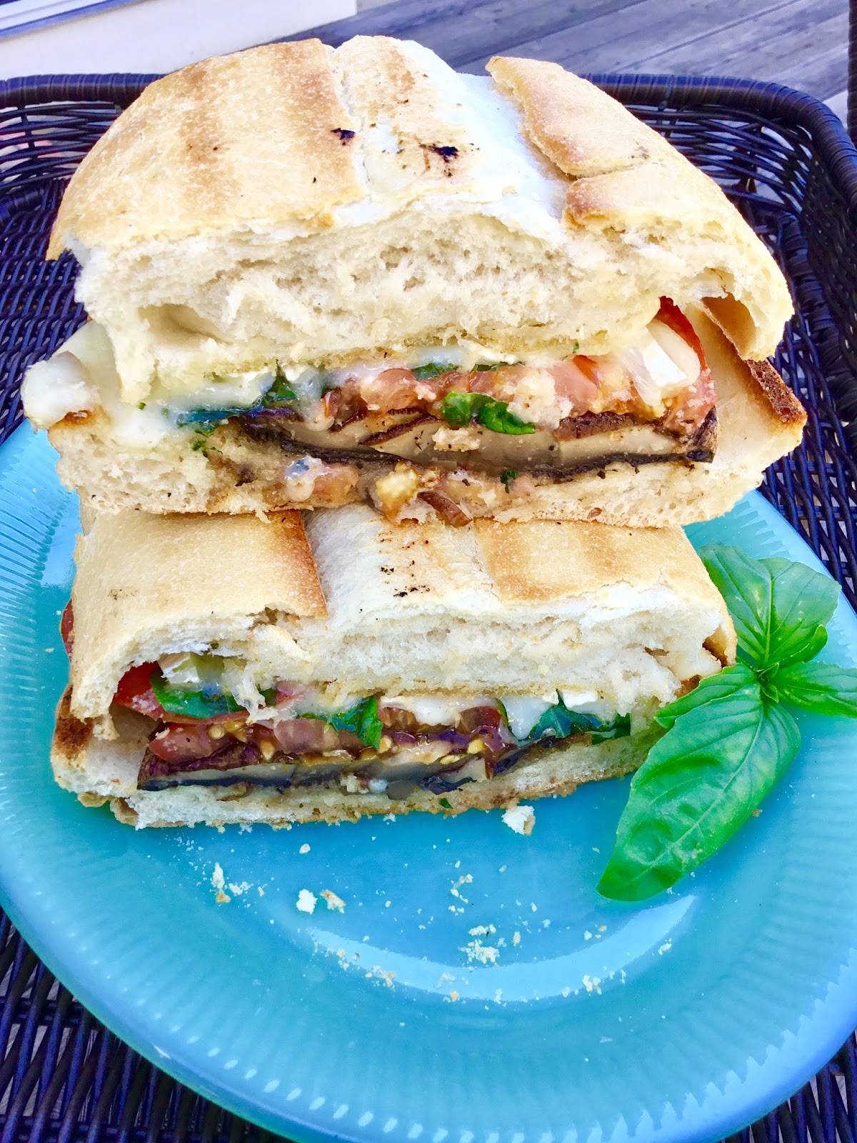 Brush bread with oil. Grill mushrooms over hot grill for 10 minutes. Grill bread for the last two minutes. Remove mushrooms and bread. Place mushroom on bottom slice of bread. Layer on top of mushroom tomato, basil then brie. Place sandwich back on grill for 2-3 minutes until Brie starts to melt. Slice into four sandwiches and serve immediately.
